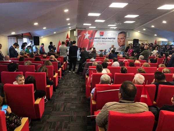 Partililerin ve vatandaşların tıklım tıklım doldurduğu CHP Tekirdağ İl Başkanlığı’nda gerçekleşen açıklamaya CHP Tekirdağ İl Başkanı Şenol Özgür Taşmerdivenli ve CHP Süleymanpaşa İlçe Başkanı Ali Engin ile birlikte gelen Cumhuriyet Halk Partisi Süleymanpaşa Belediye Başkan Adayı Murat Uysal alkışlar ve tezahüratlar eşliğinde karşılandı.